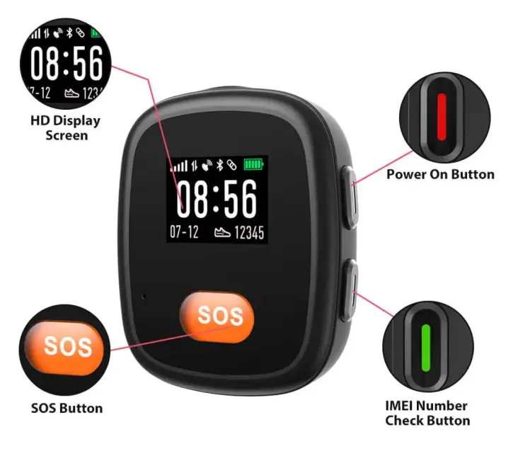 - Functions: SOS, GPS, fall detection, HR/SpO₂ options, BLE/app integration